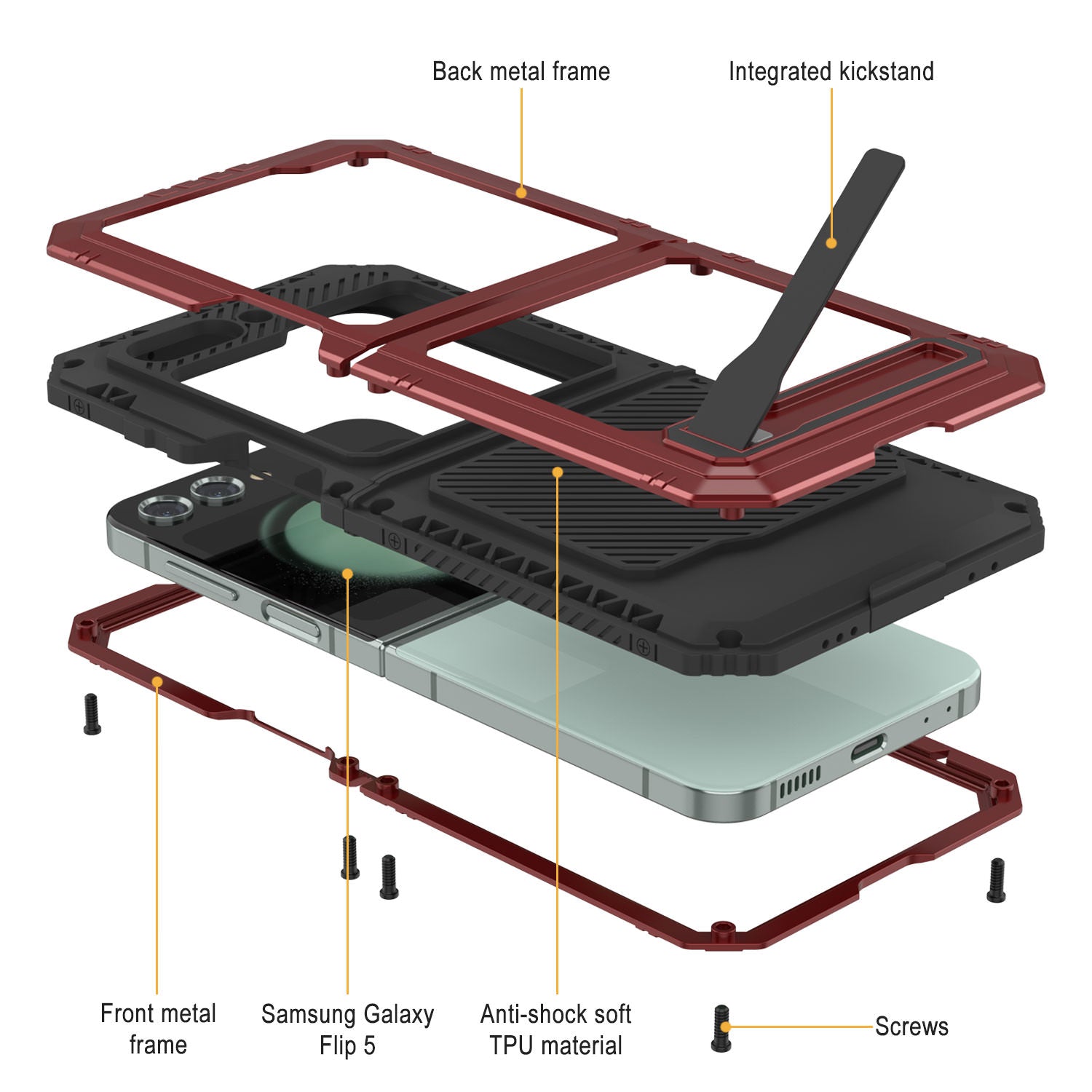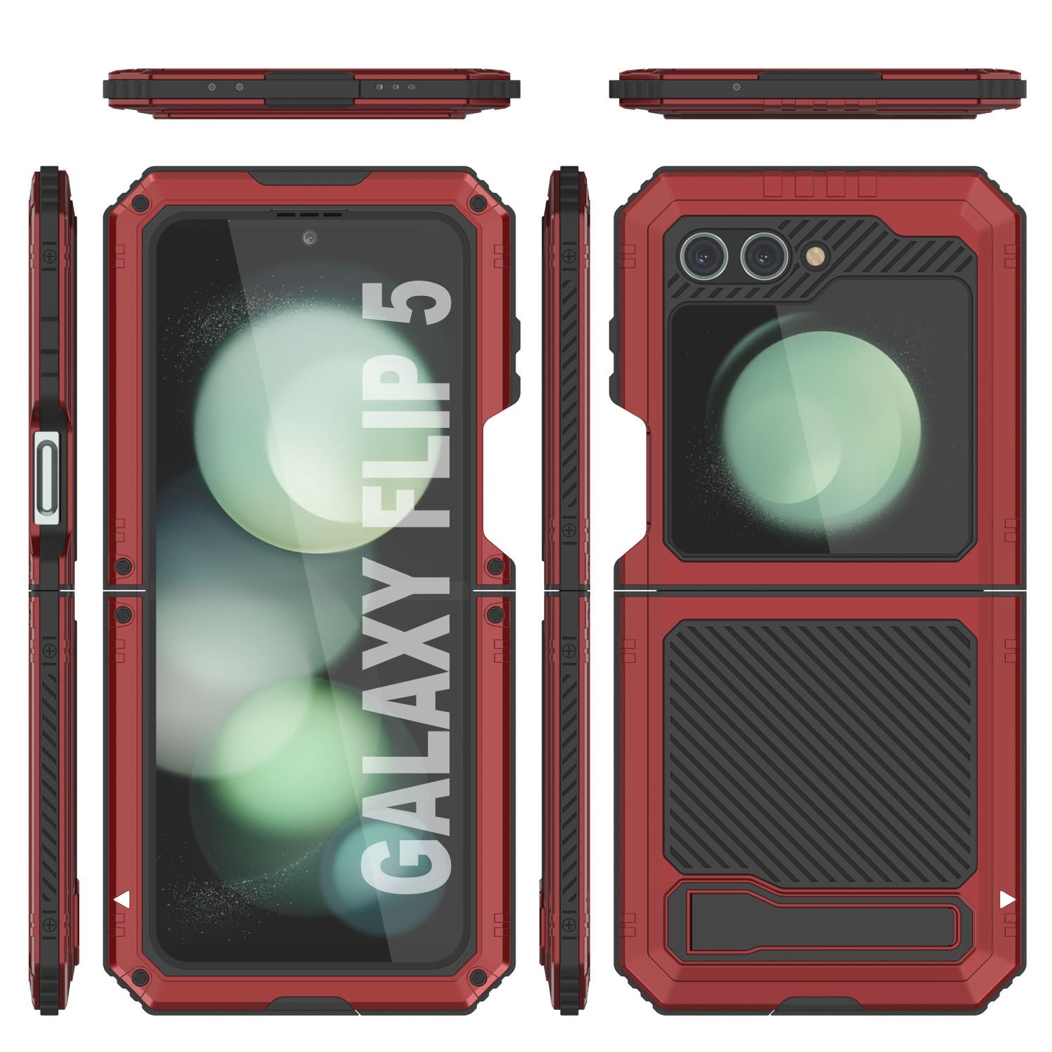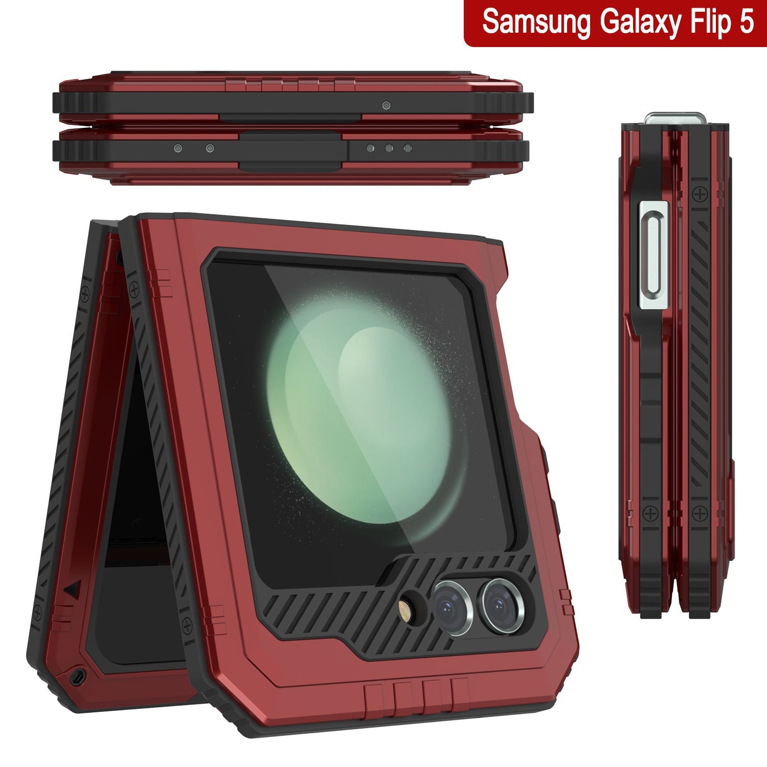 - ★ ULTIMATE DUAL LAYER PROTECTION: Ultra tough front and back aluminum frames enclose a shock-absorbing TPU layer resulting in superior protection from drops and falls | Additional CAMERA LENS PROTECTION due to raised bevel |HONEYCOMB COOLING SYSTEM: Specially molded cooling grooves in the back of the case ensure heat dissipation to protect your Galaxy Z Flip5 from damage due to overheating