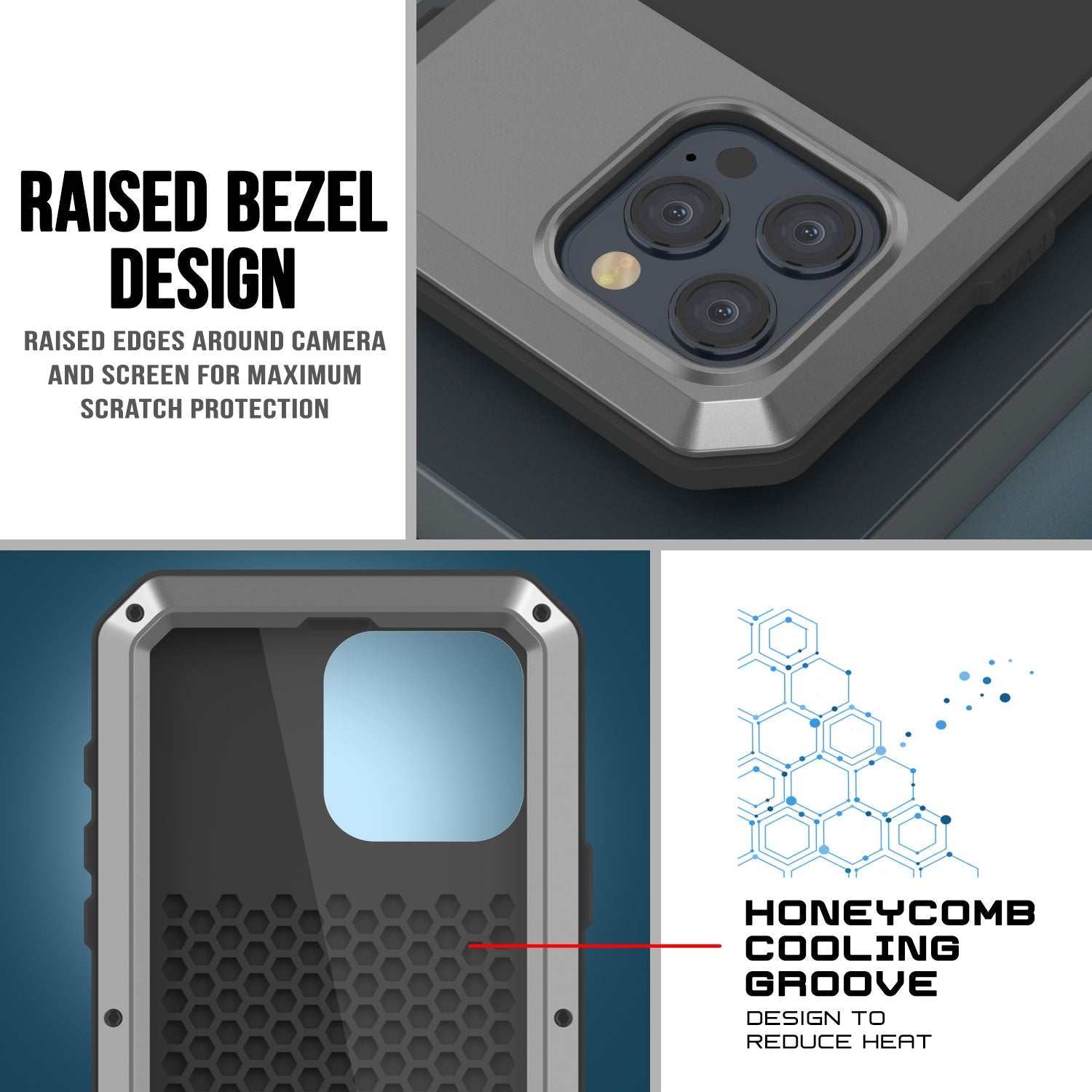 - ★ ULTIMATE DUAL LAYER PROTECTION: Ultra tough front and back aluminum frames enclose a shock-absorbing TPU layer resulting in superior protection from drops and falls | Additional CAMERA LENS PROTECTION due to raised bevel |HONEYCOMB COOLING SYSTEM: Specially molded cooling grooves in the back of the case ensure heat dissipation to protect your iPhone 15 Pro from damage due to overheating