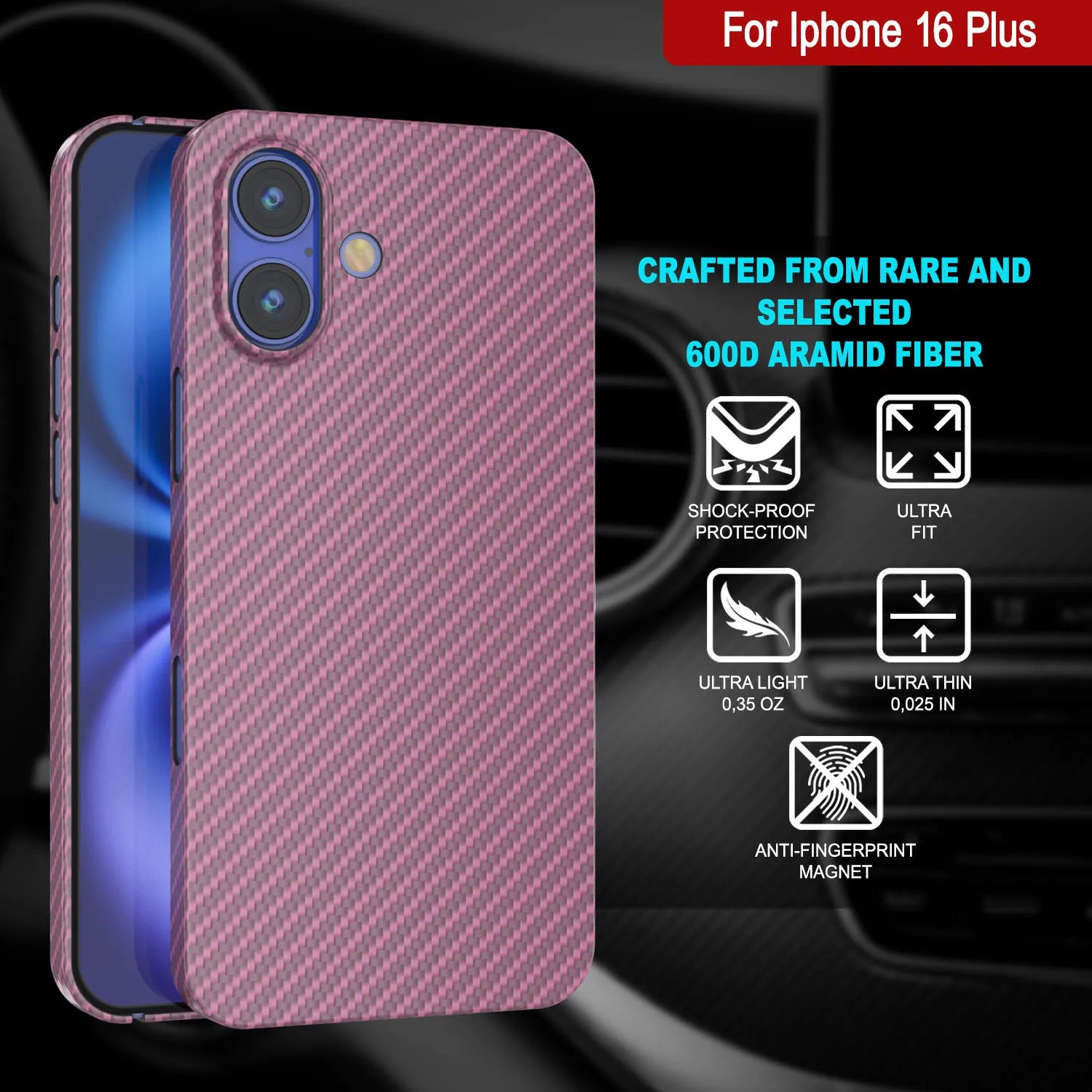 Punkcase for iPhone 16 Plus Carbon Fiber Case [AramidShield Series] Ultra Slim & Light Kevlar Skin Made from 100% Real Aramid Fiber | Military Grade Protection for Your iPhone 16 Plus (6.7") [Pink]